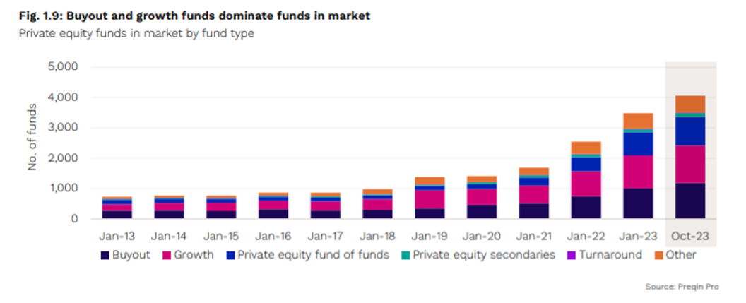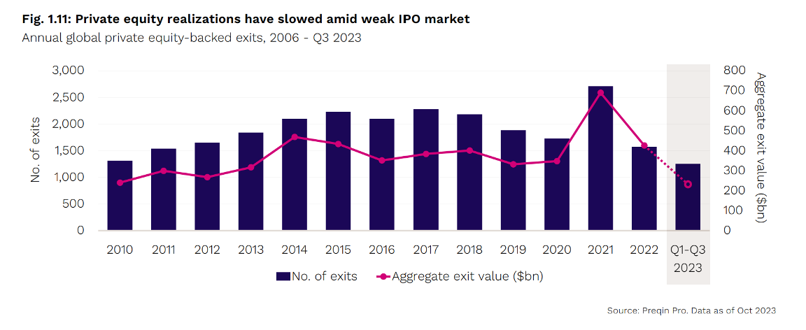Private equity exits have continued to struggle in the last few years and as result, investor funds have continued to be illiquid. A total of 1,255 were completed in the first nine months of 2023, worth $232.4bn in aggregate value, representing 80% of the number achieved in 2022 as a whole, but only 55% by value.