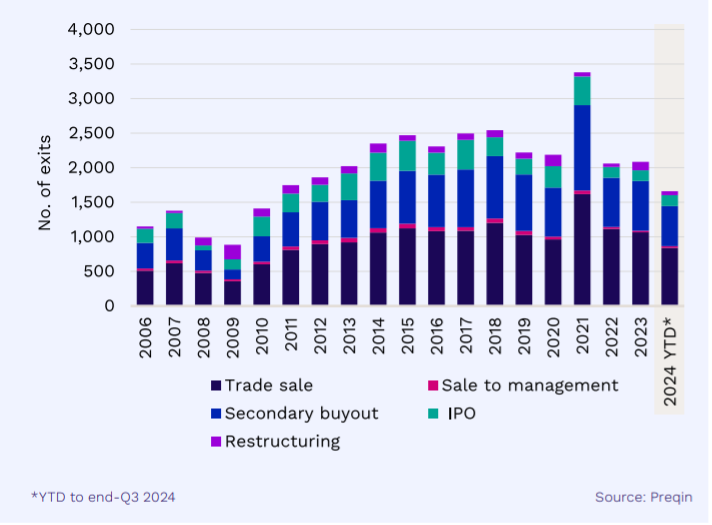 IPOs accounted for 9% of all exits by the third quarter of 2024, a historically low level akin to the 2008 credit crunch. Nevertheless, it is up from just 7% in 2023, signaling a potential bottoming out last year.