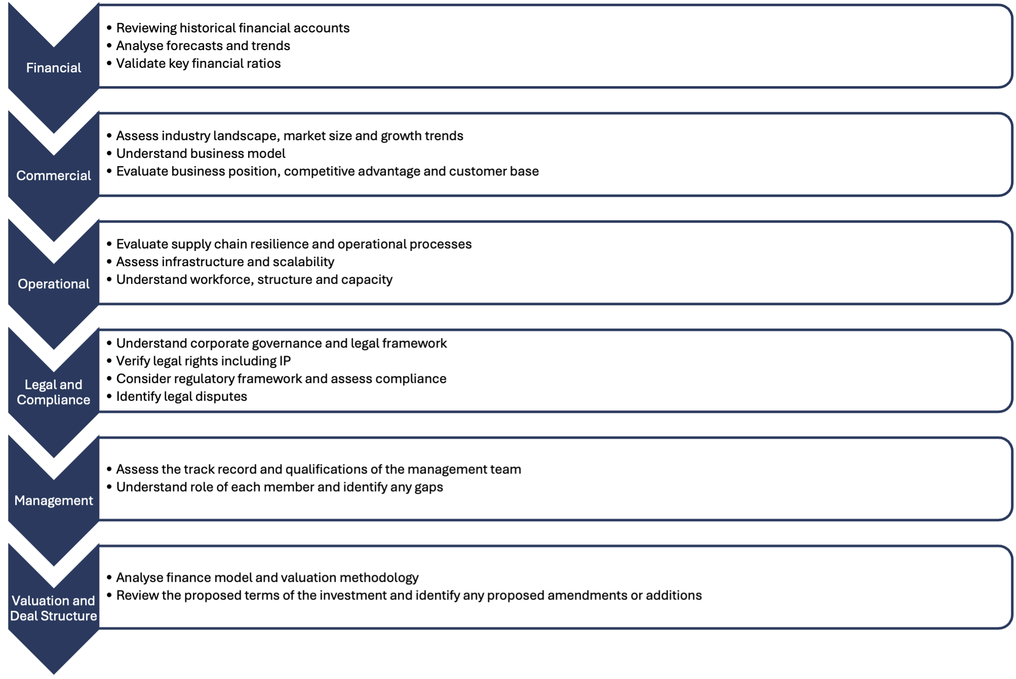 Due diligence is a comprehensive and systematic process undertaken to evaluate a business before committing to an investment. The objective is to verify the company’s financial health, operational efficiency, management quality, market position, and compliance with regulations. This process is essential as it uncovers potential risks, validates financial and operational assumptions, and ensures that the investment aligns with the investor's goals. Additionally, as the due diligence process progresses, naturally, the funnel narrows and any skeletons uncovered throughout the process may form bargaining chips for negotiating structure and pricing – or become dealbreakers.